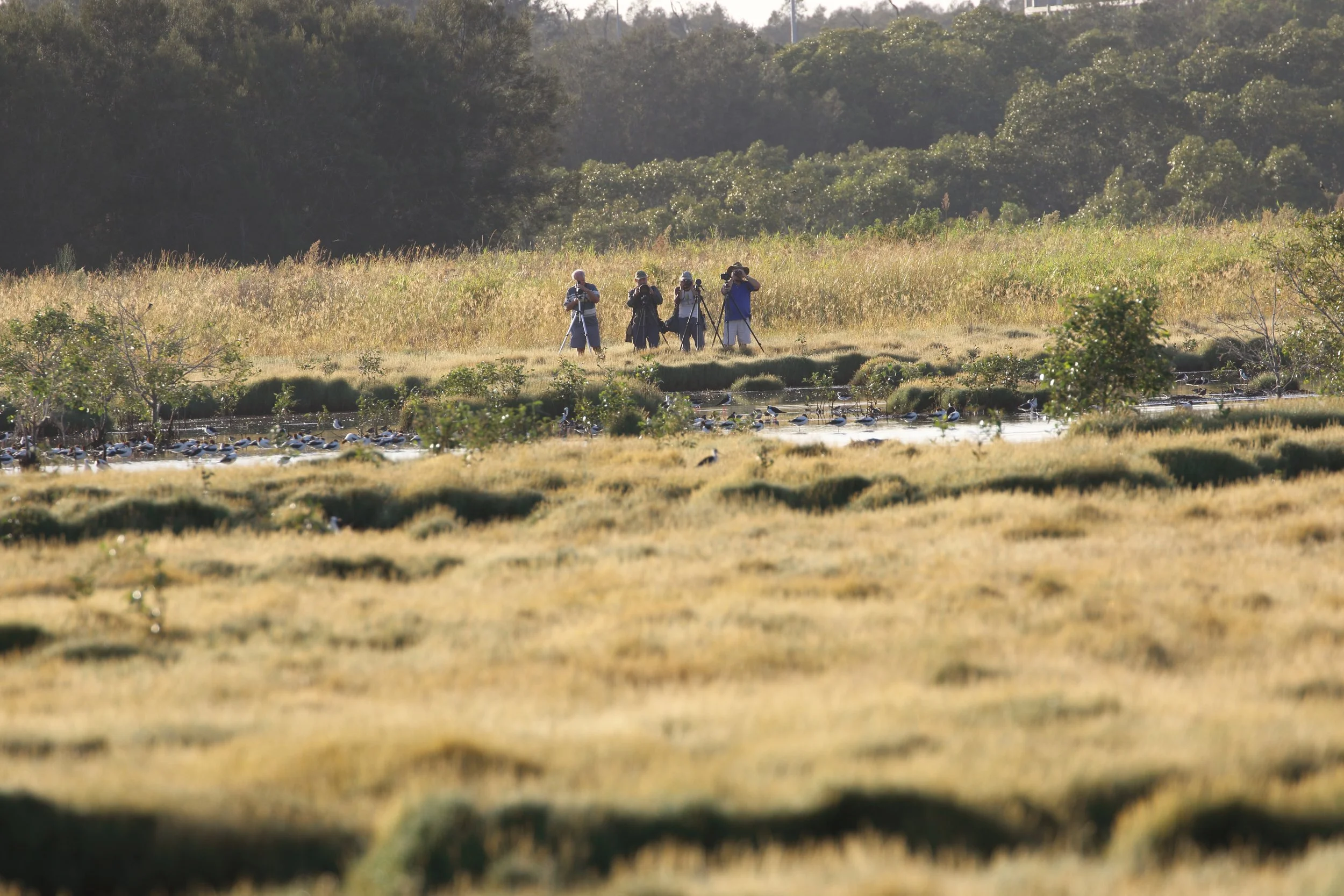 Birders watching the Long-toed Stint at Kedron Brook Wetlands.