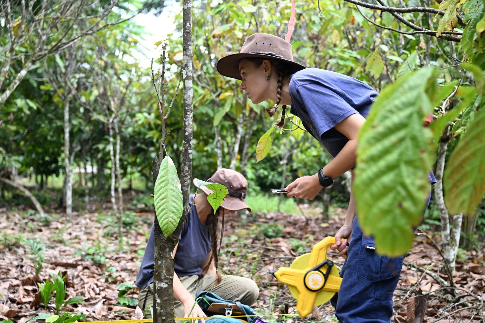Hannah carefully inspects the plants growing in a cocoa farm.