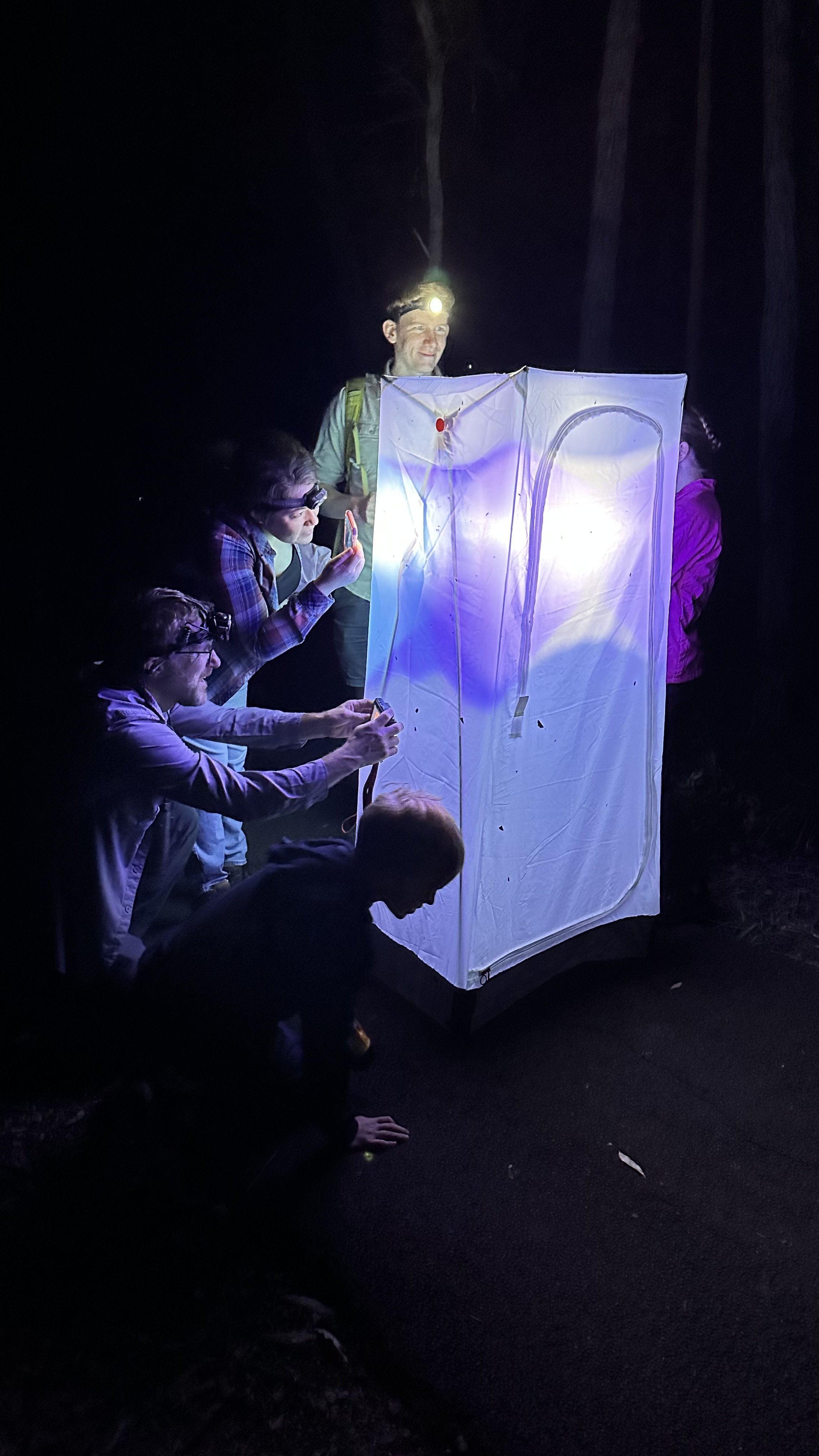 A group of us headed to Toohey Forest last night to look for insects and any other critters we might happen across. James Tweed set up a light in the forest, consisting of a LepiLED powered by a USB powerbank hanging inside an IKEA wardrobe! This setup was relatively new to us, with previous standard operating procedure being to set up a sheet with a UV light nearby. The wardrobe system is excellent, because insects can approach from any direction and settle, and multiple people can circulate around the wardrobe. Although, seeing a bunch of people dancing around a wardrobe in the middle of the forest must have been a very strange sight to the couple of folks that passed by! The system is very portable, and we were keen to know how well it would perform.